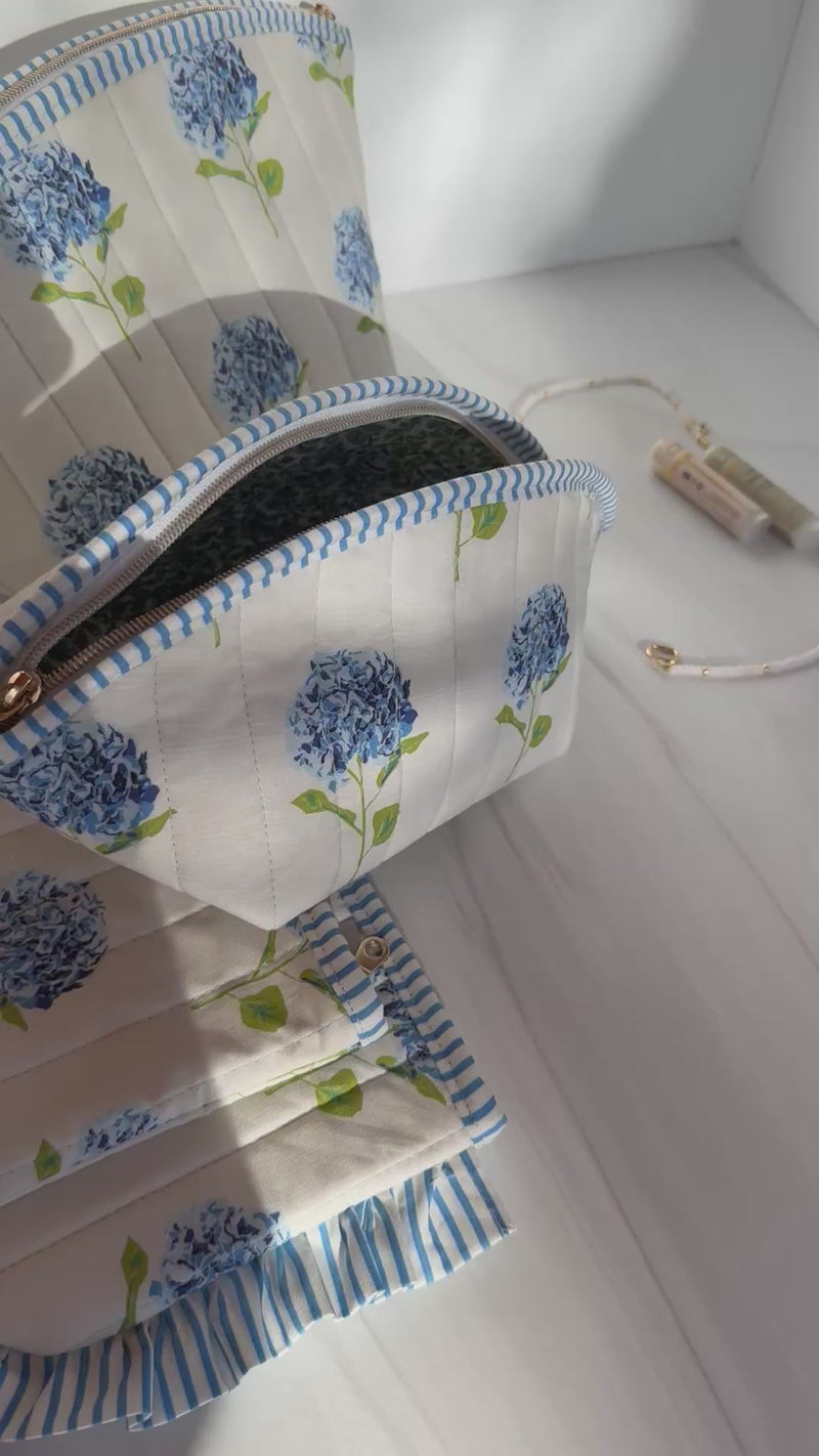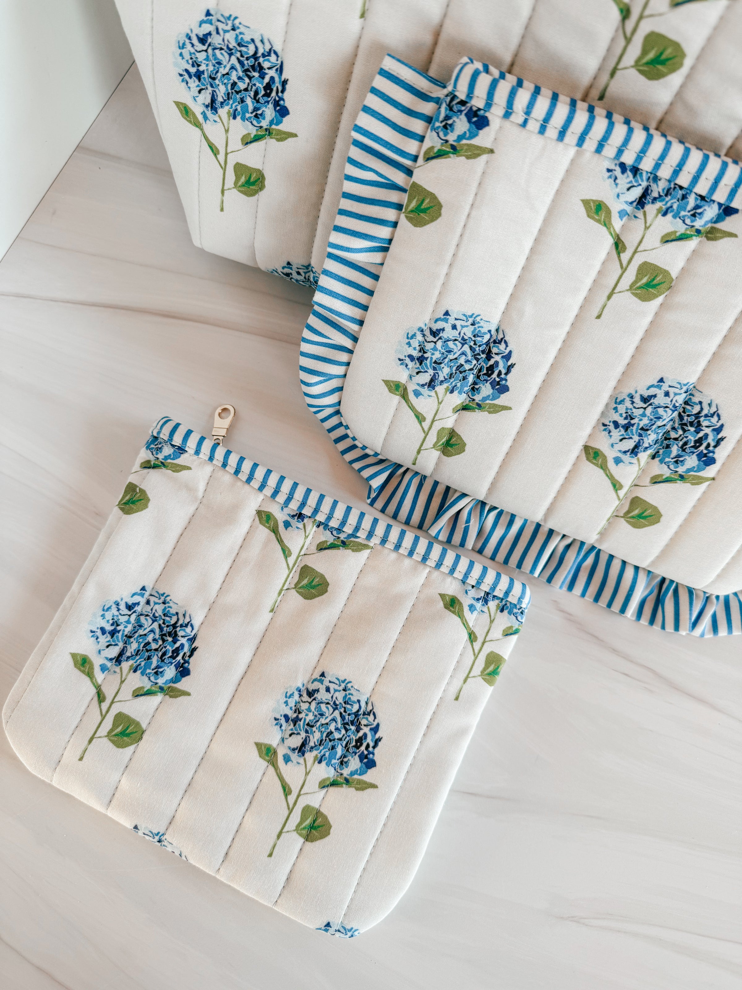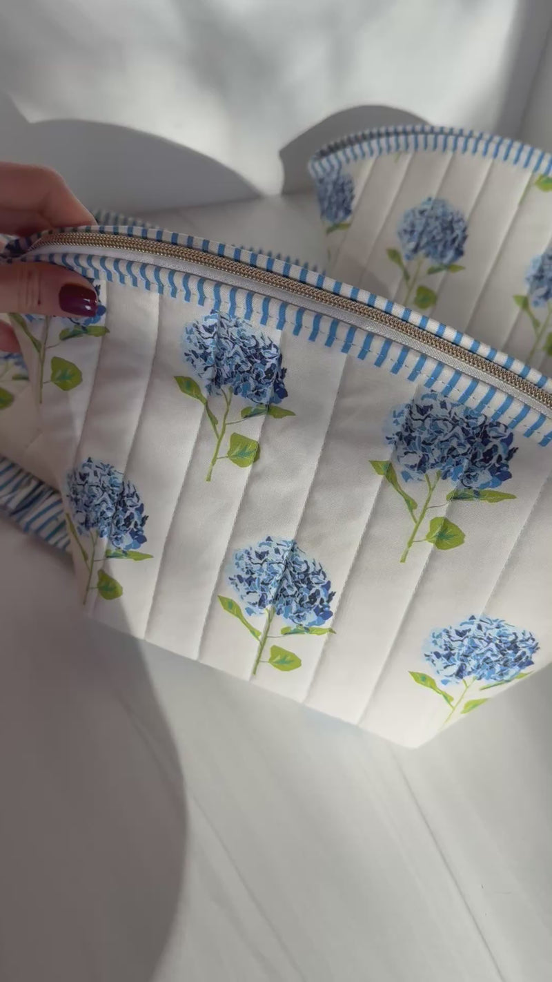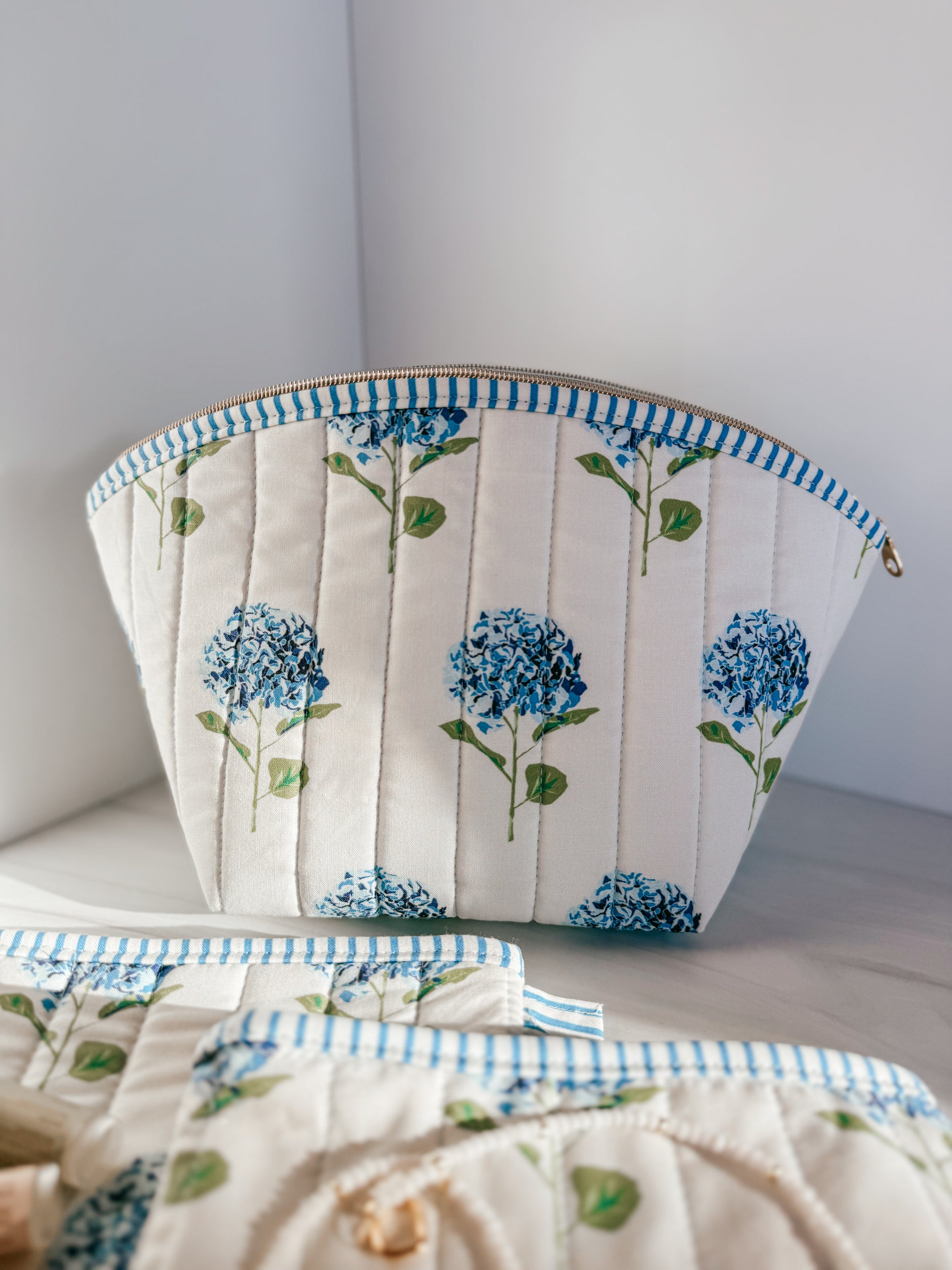 Inspired by coastal mornings and fresh garden blooms, the Nantucket Hydrangea quilted bag collection brings soft beauty and functional design to your daily routine. Each bag is crafted from 100% cotton with vertical quilted stitching, a smooth gold zipper, and a matching tassel pull.