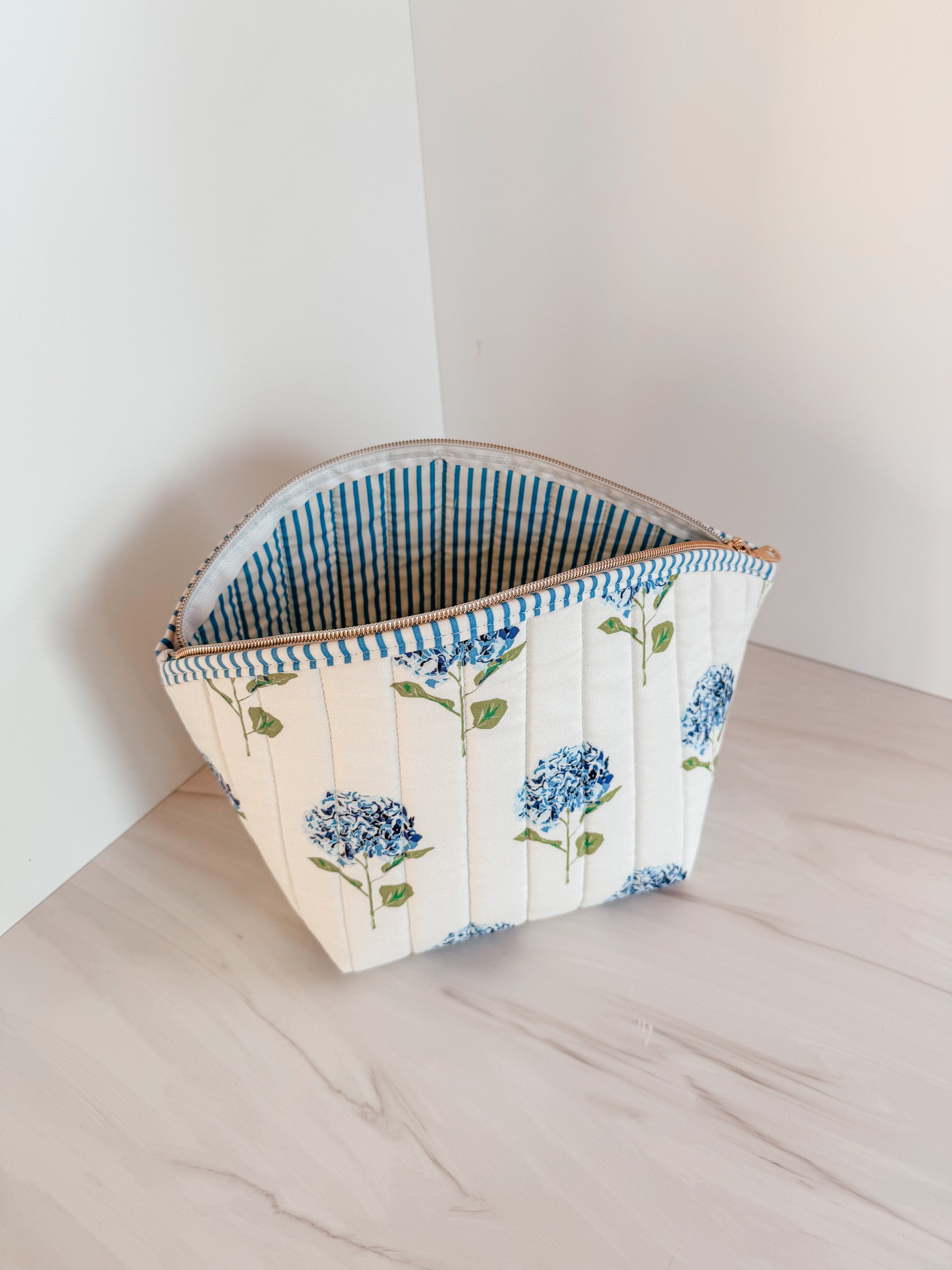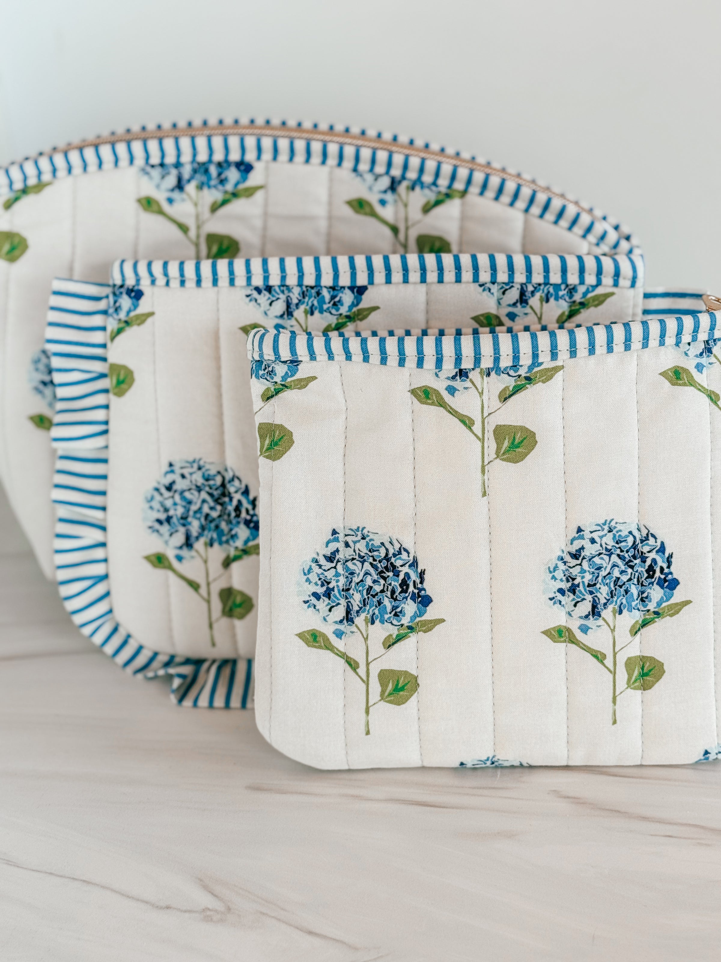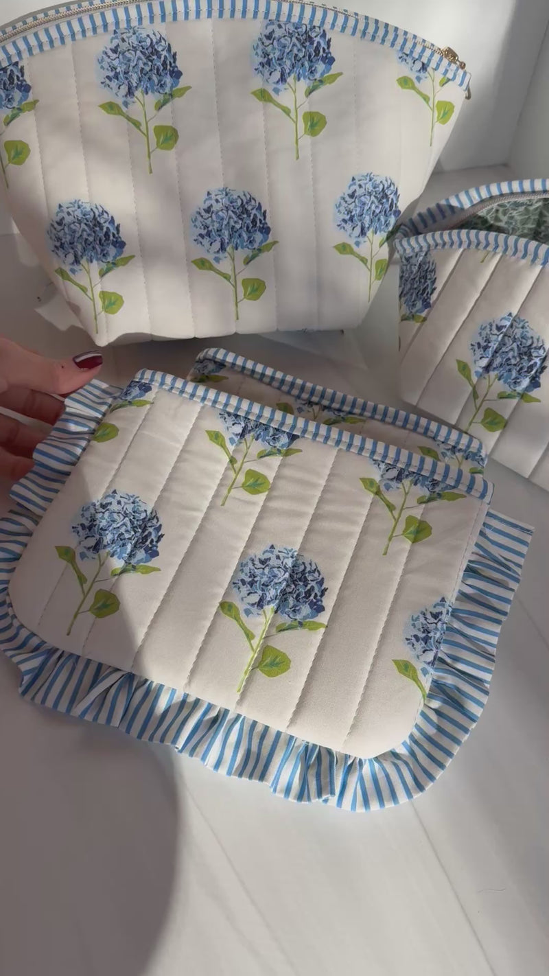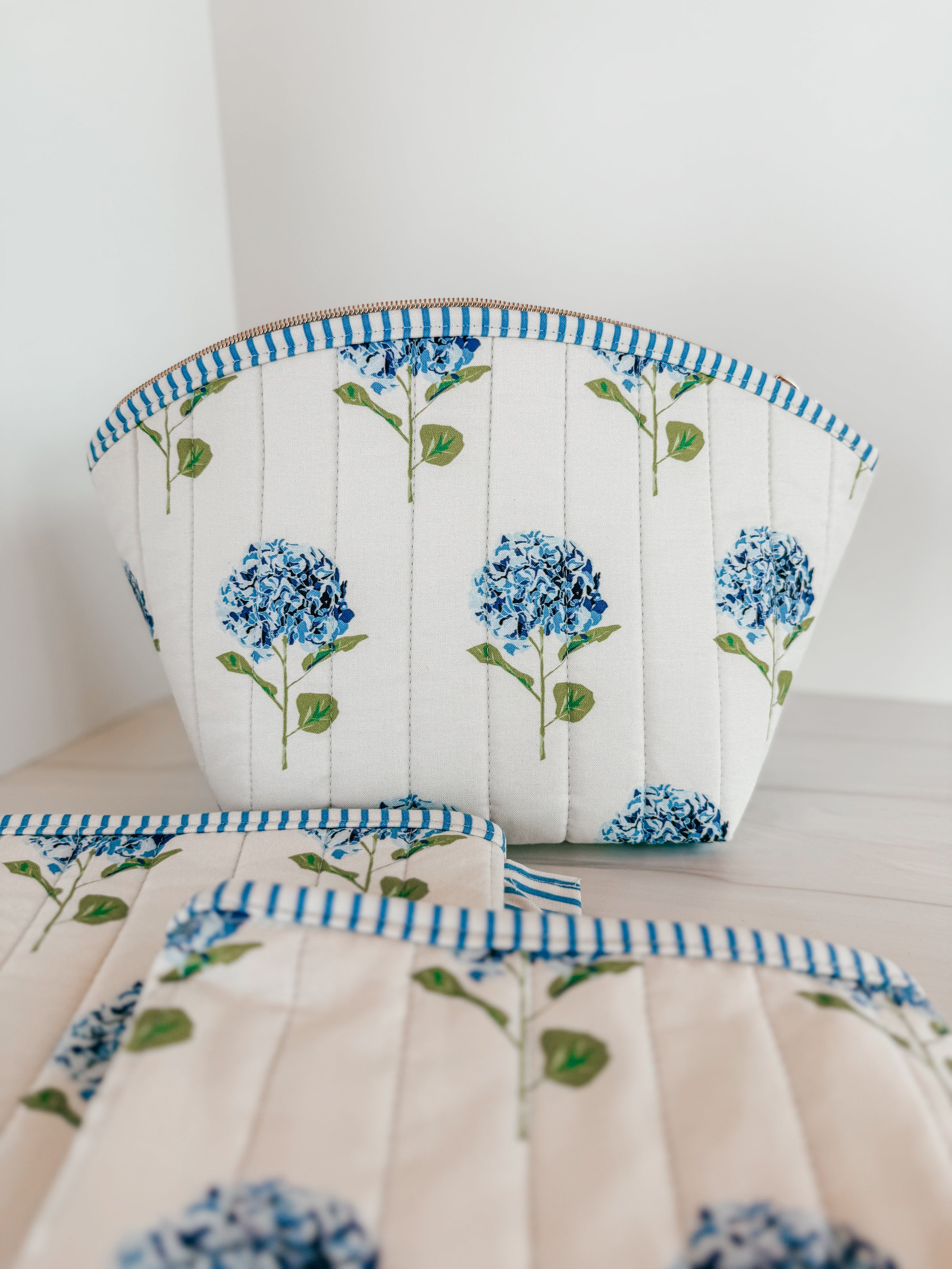 Inspired by coastal mornings and fresh garden blooms, the Nantucket Hydrangea quilted bag collection brings soft beauty and functional design to your daily routine. Each bag is crafted from 100% cotton with vertical quilted stitching, a smooth gold zipper, and a matching tassel pull.