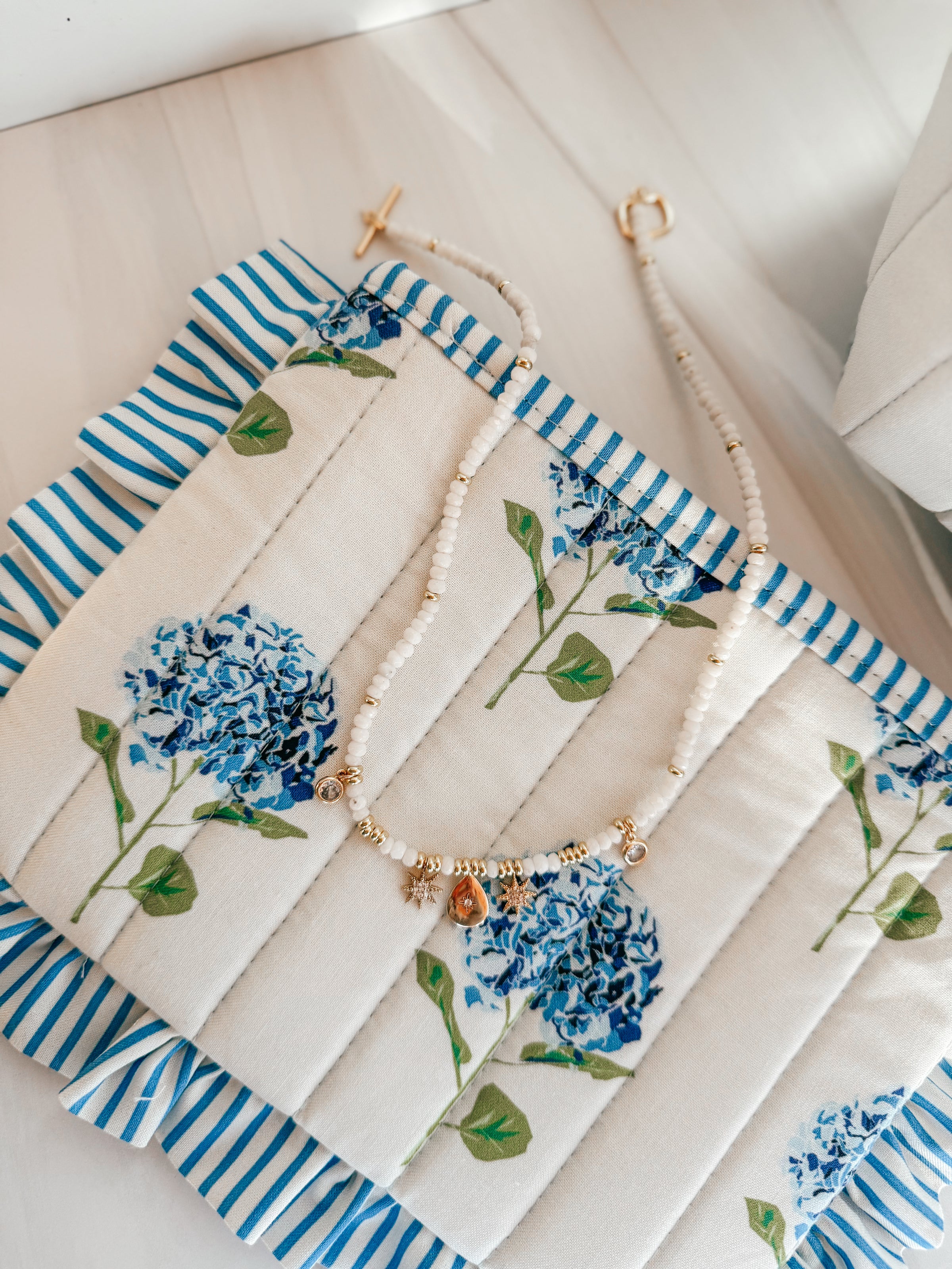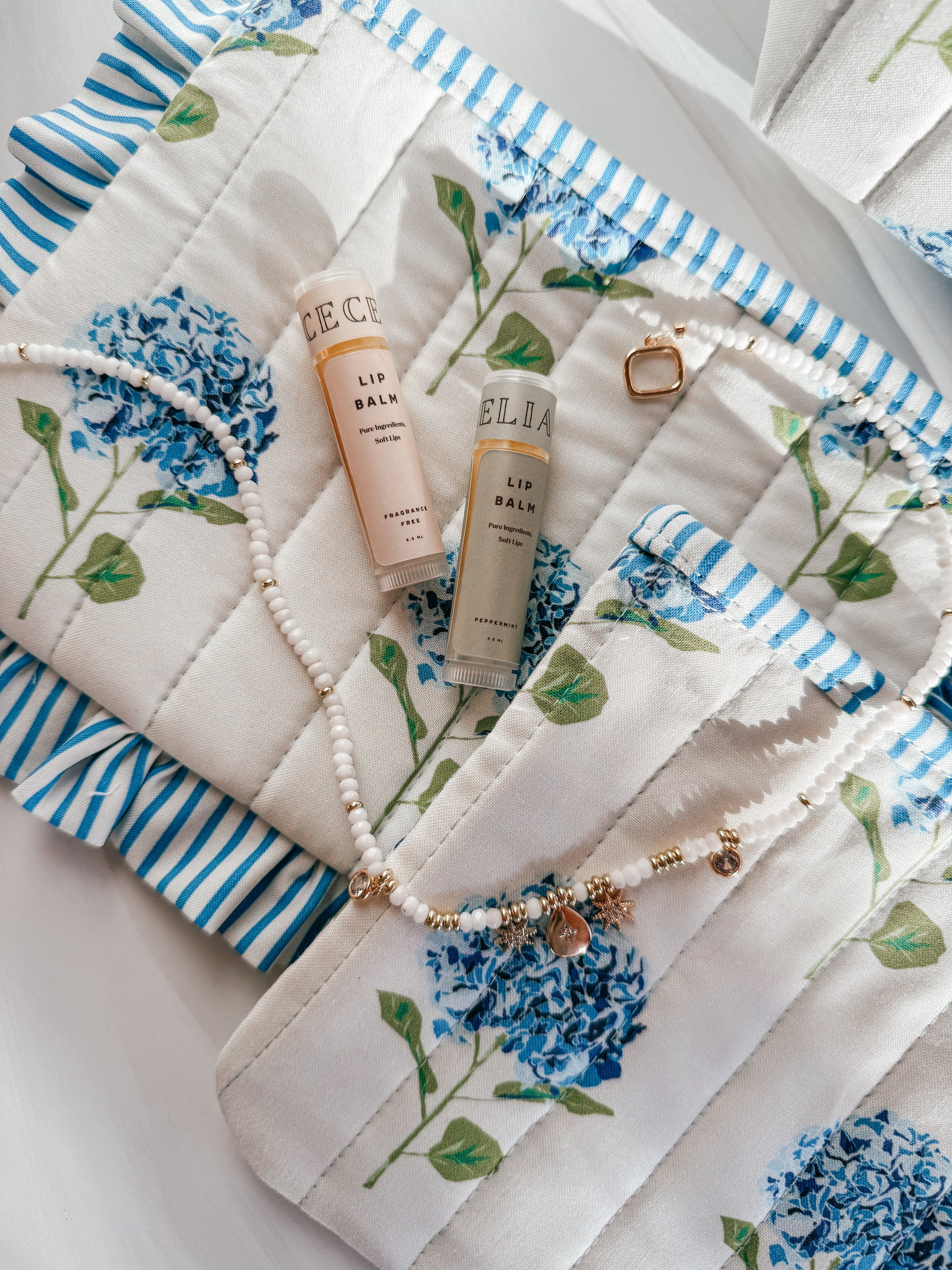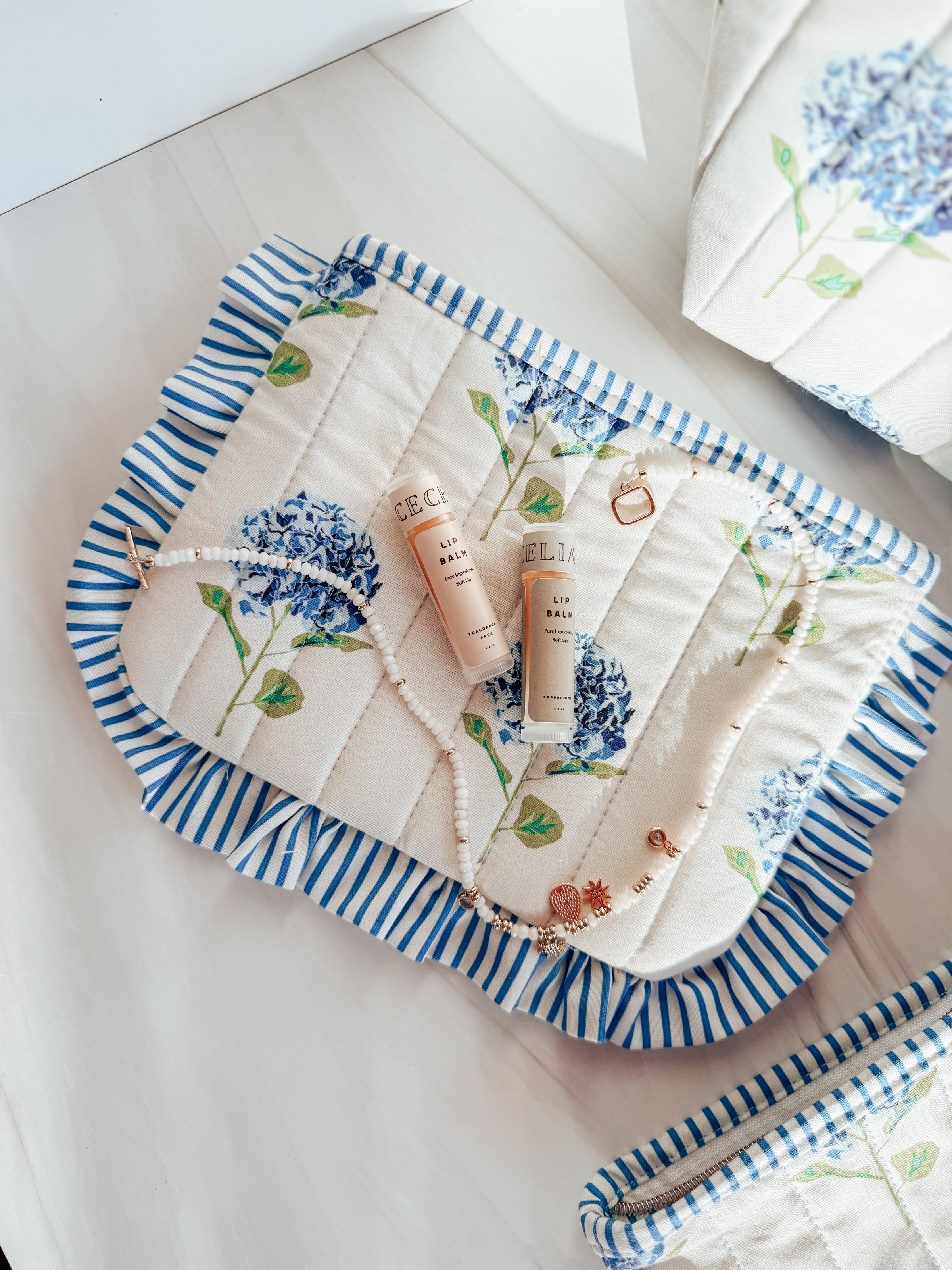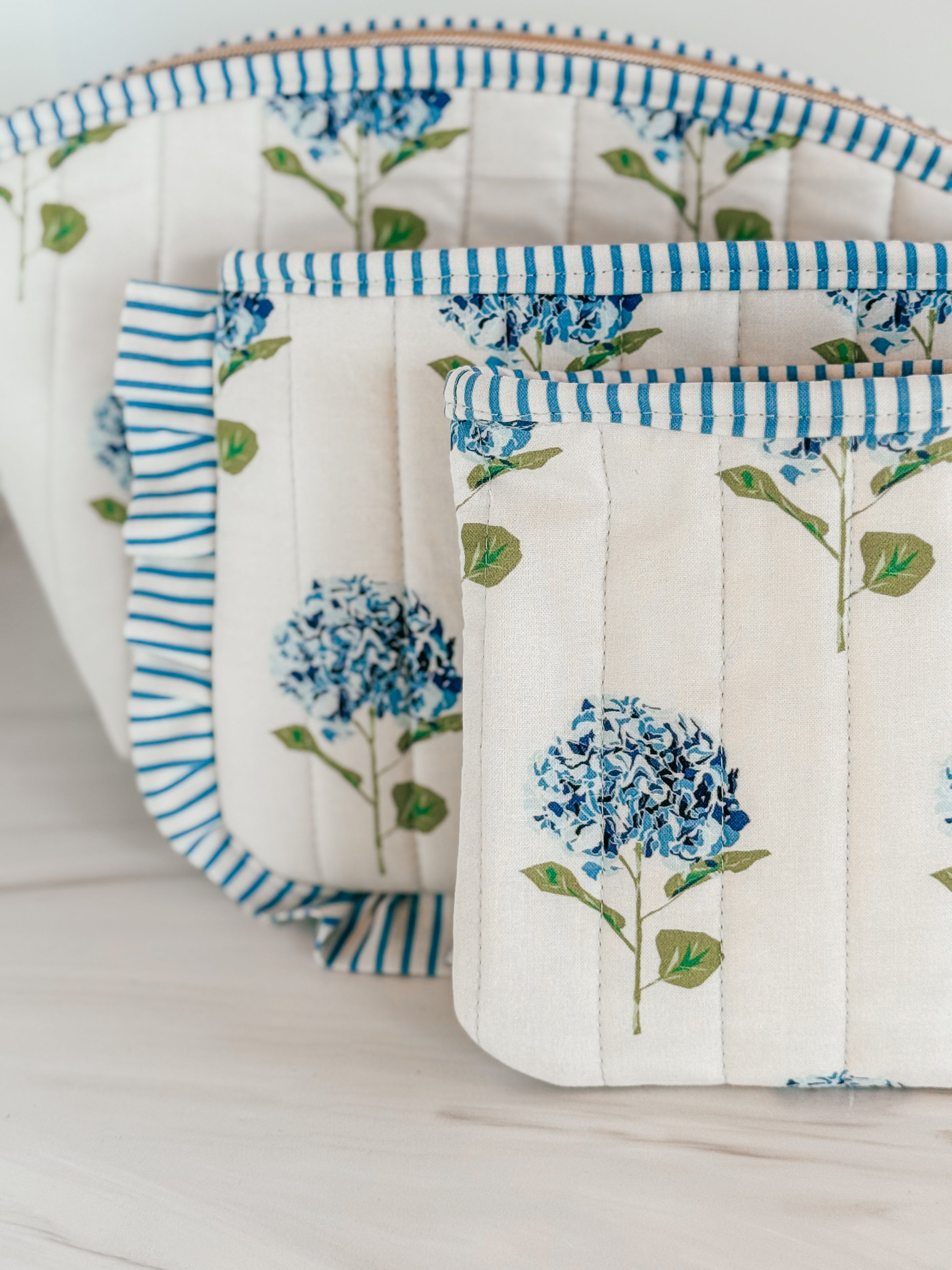Inspired by coastal mornings and fresh garden blooms, the Nantucket Hydrangea quilted bag collection brings soft beauty and functional design to your daily routine. Each bag is crafted from 100% cotton with vertical quilted stitching, a smooth gold zipper, and a matching tassel pull.