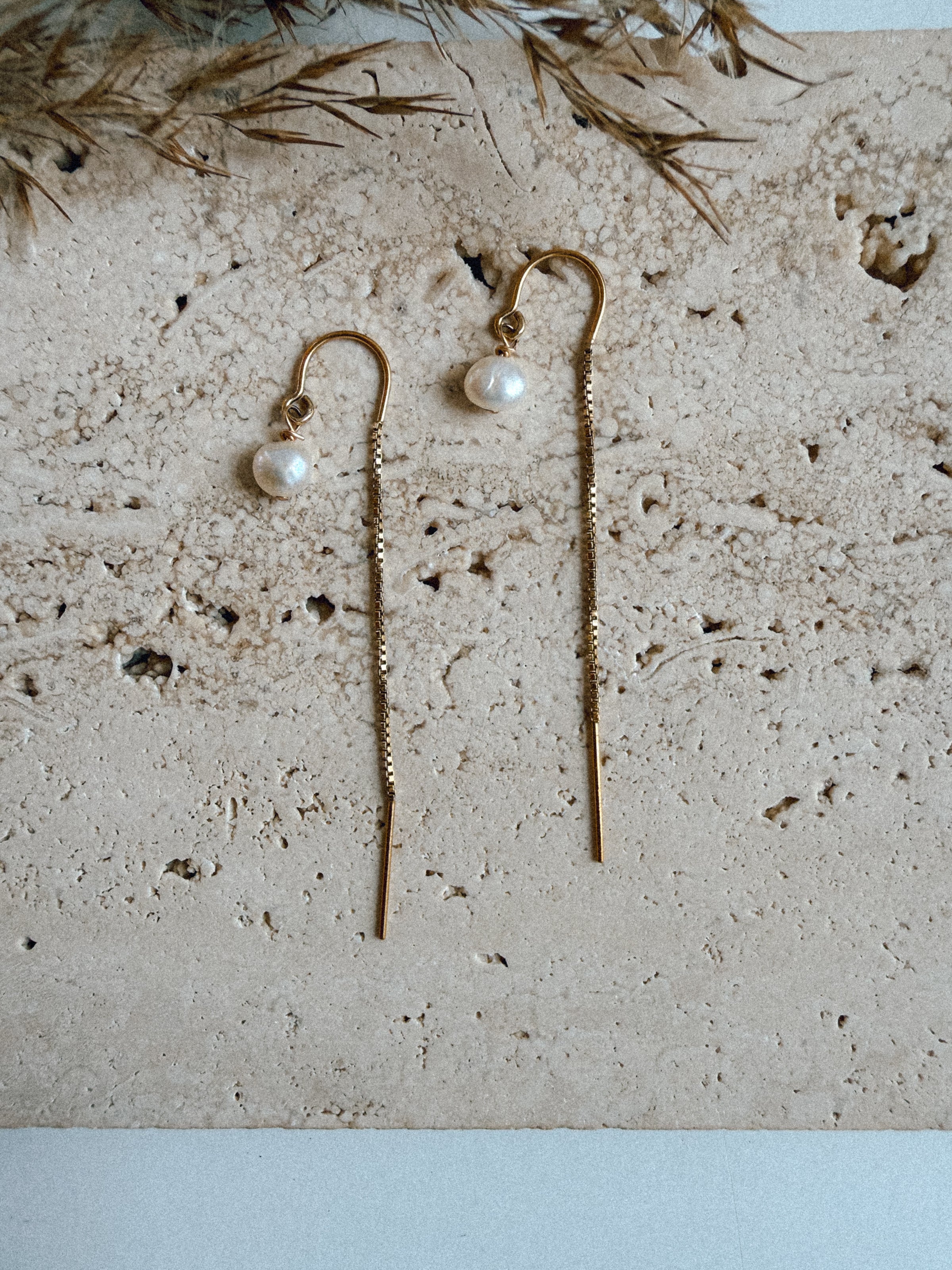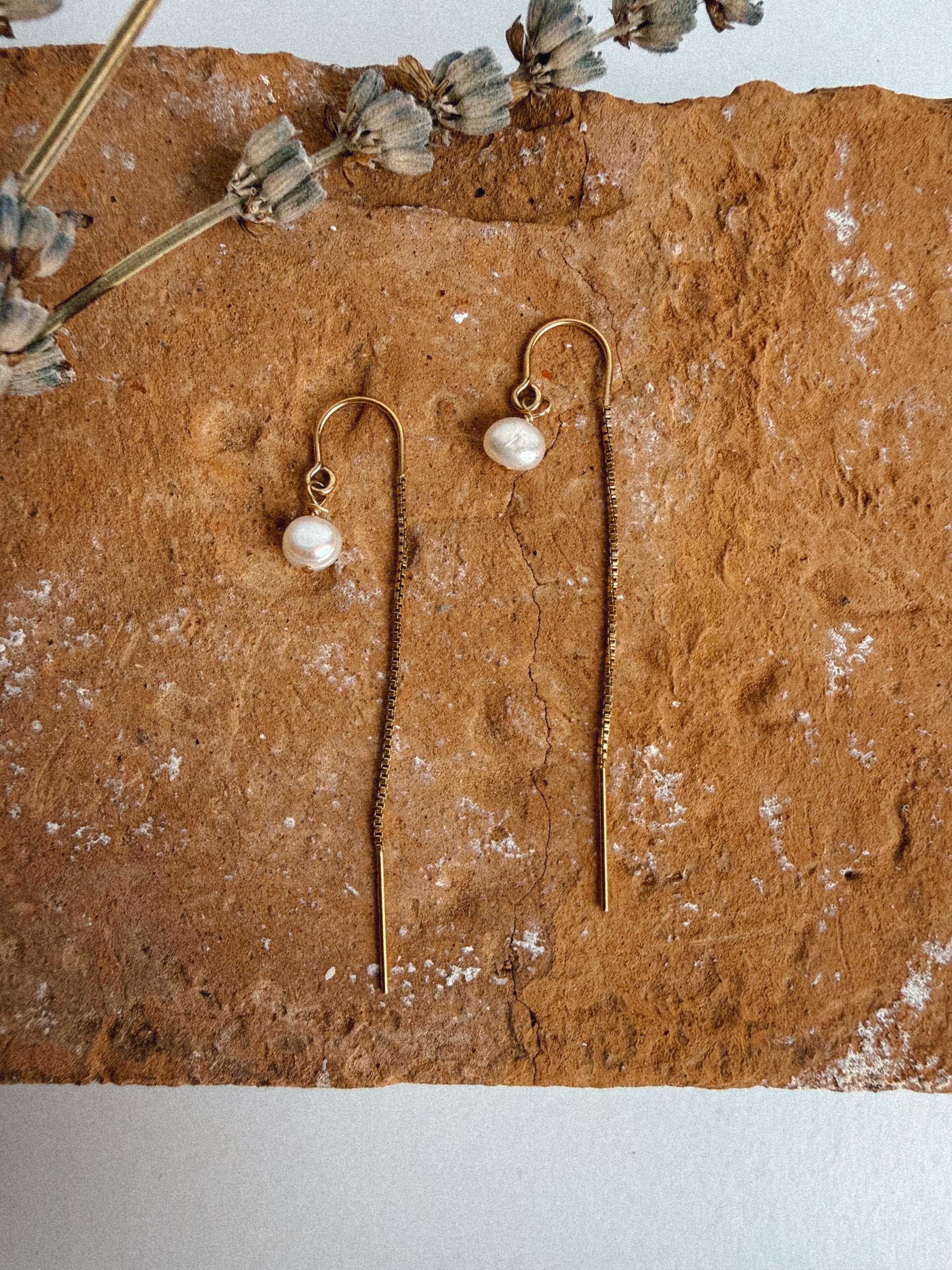 Crafted with gold filled threader chains and finished with a genuine pearl accent, each pair features soft, luminous tones and natural variations in shape and surface, making every set one of a kind. The delicate, lightweight design allows the earrings to glide effortlessly through the ear, creating a graceful, elongated silhouette.