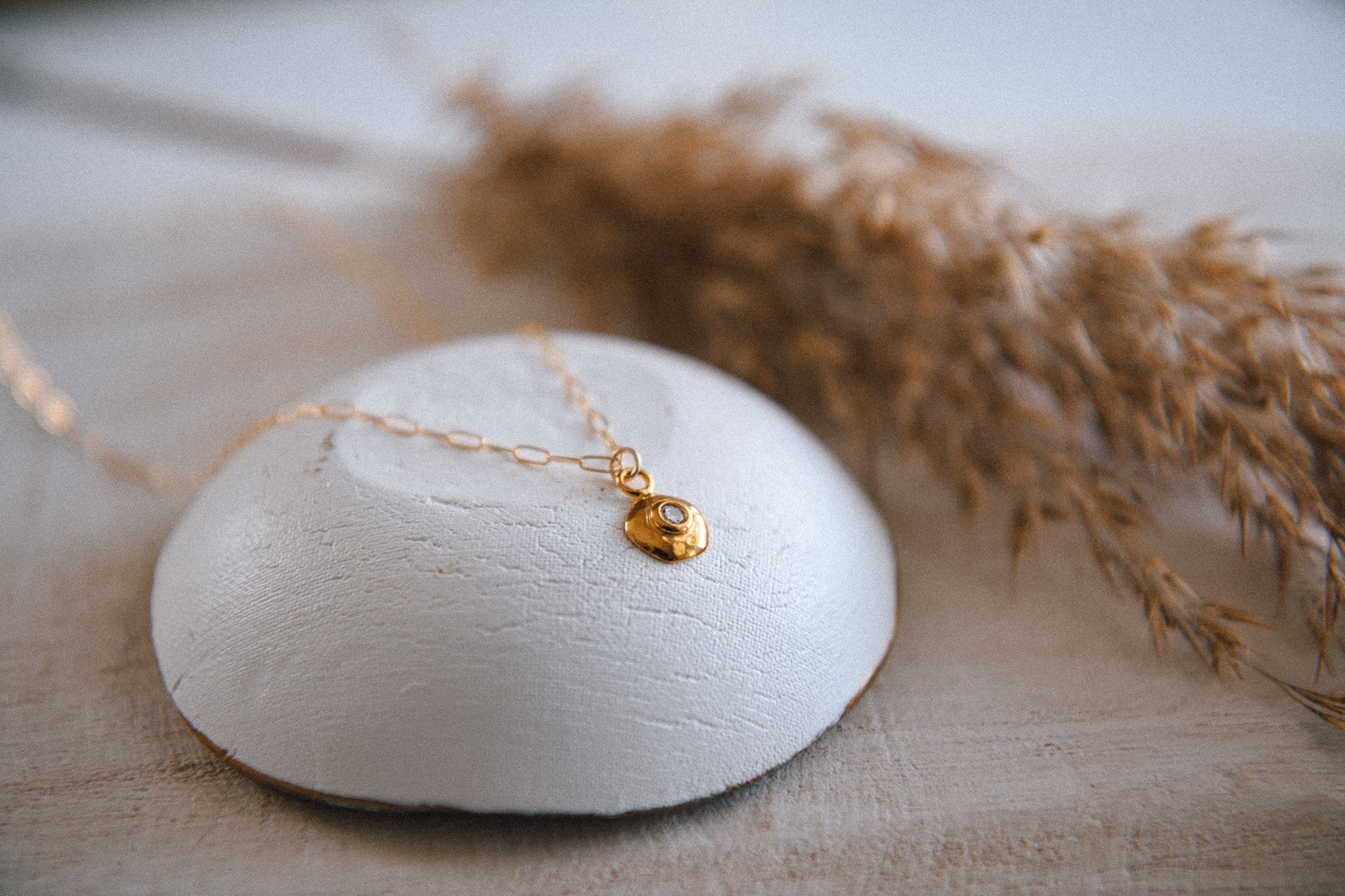 The Orbit Necklace features a textured gold charm with a clear crystal at its center. Like a moon caught in orbit, this minimalist piece captures movement and light with subtle grace.